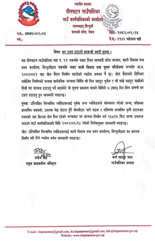 घर टहरा हटाउने सम्बन्धी जरुरी सूचना।