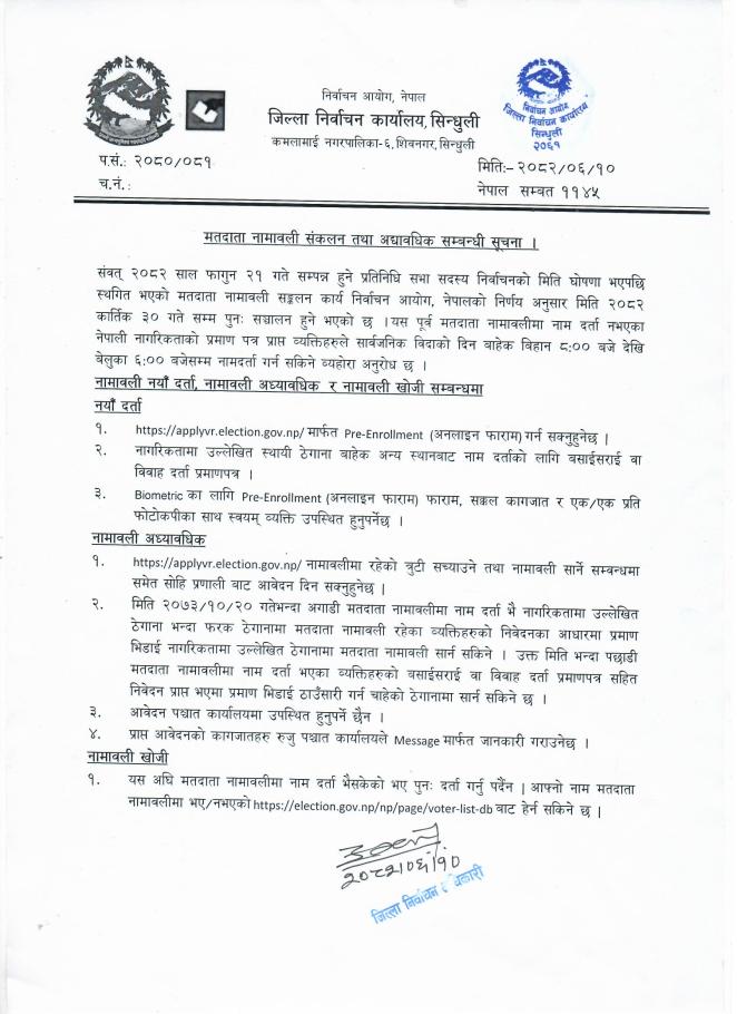 जिल्ला निर्वाचन कार्यालय, सिन्धुलीको सूचना।