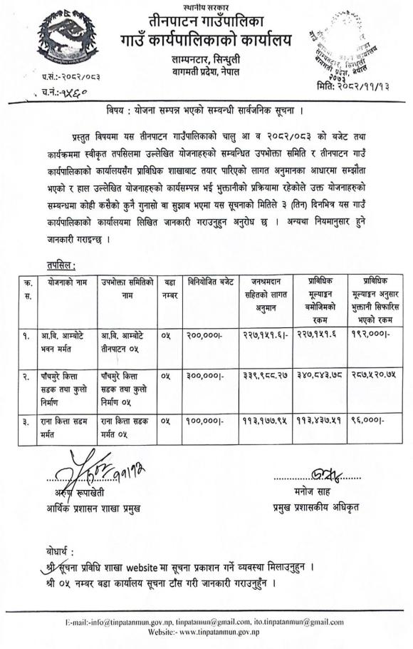 यस गाउँपालिकाको दैनिक प्रशासनिक लगायत विकास निर्माणका कामकाज बारे कुनै गुनासो, राय सल्लाह, सुझाव भए गाउँपालिकाका अध्यक्ष ज्यू, उपाध्यक्ष ज्यू र प्रमुख प्रशासकीय अधिकृतसँग वा हाम्रो फेसबुक पेजमा राख्नु हुन अनुरोध छ ।