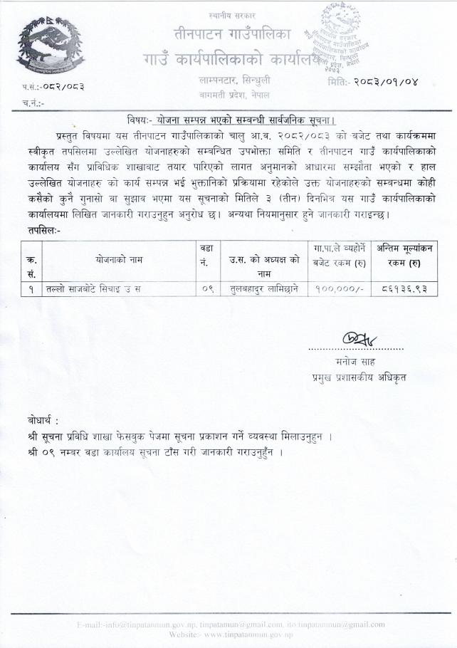 योजना सम्पन्न भएको सम्बन्धी साार्वजनिक सूचना।