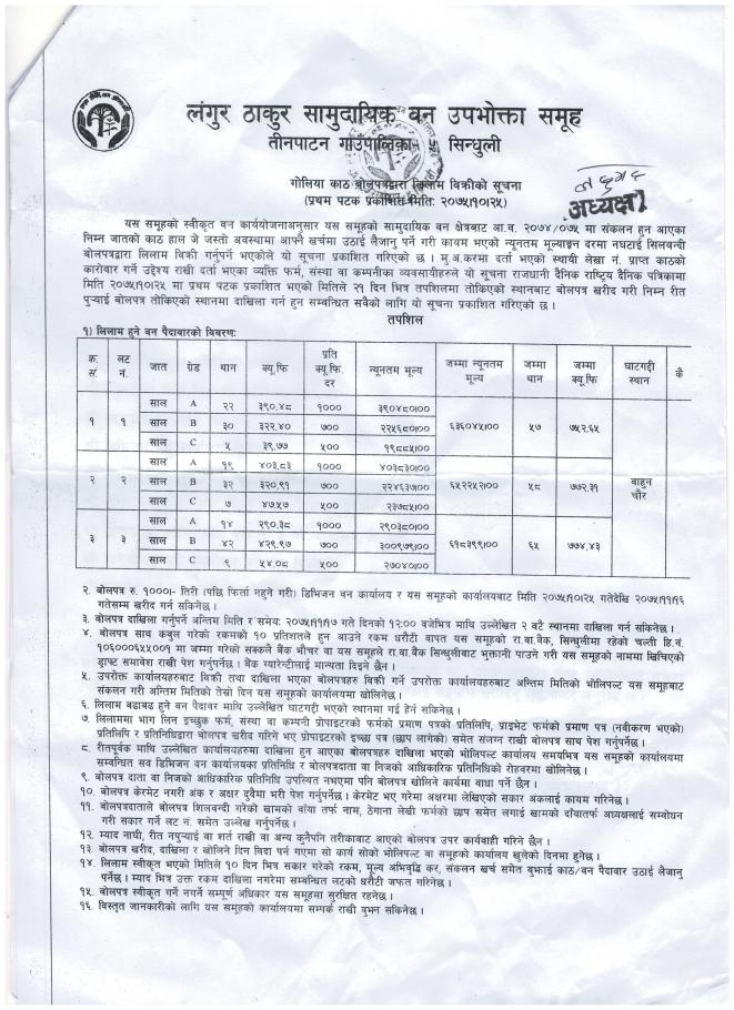 गाेलिया काठ बाेलपत्रद्बारा लिलाम विक्रीकाे सूचना ।।