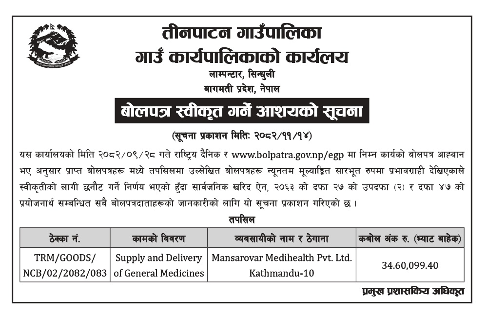 यस गाउँपालिकाको दैनिक प्रशासनिक लगायत विकास निर्माणका कामकाज बारे कुनै गुनासो, राय सल्लाह, सुझाव भए गाउँपालिकाका अध्यक्ष ज्यू, उपाध्यक्ष ज्यू र प्रमुख प्रशासकीय अधिकृतसँग वा हाम्रो फेसबुक पेजमा राख्नु हुन अनुरोध छ ।