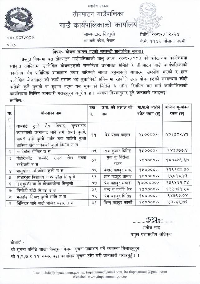 यस गाउँपालिकाको दैनिक प्रशासनिक लगायत विकास निर्माणका कामकाज बारे कुनै गुनासो, राय सल्लाह, सुझाव भए गाउँपालिकाका अध्यक्ष ज्यू, उपाध्यक्ष ज्यू र प्रमुख प्रशासकीय अधिकृतसँग वा हाम्रो फेसबुक पेजमा राख्नु हुन अनुरोध छ ।