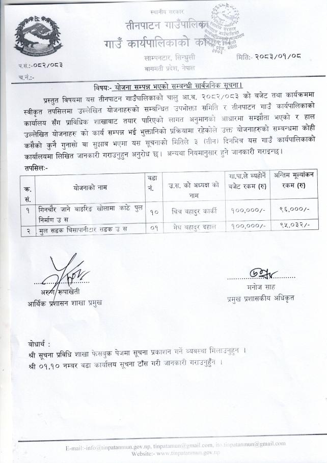 यस गाउँपालिकाको दैनिक प्रशासनिक लगायत विकास निर्माणका कामकाज बारे कुनै गुनासो, राय सल्लाह, सुझाव भए गाउँपालिकाका अध्यक्ष ज्यू, उपाध्यक्ष ज्यू र प्रमुख प्रशासकीय अधिकृतसँग वा हाम्रो फेसबुक पेजमा राख्नु हुन अनुरोध छ ।