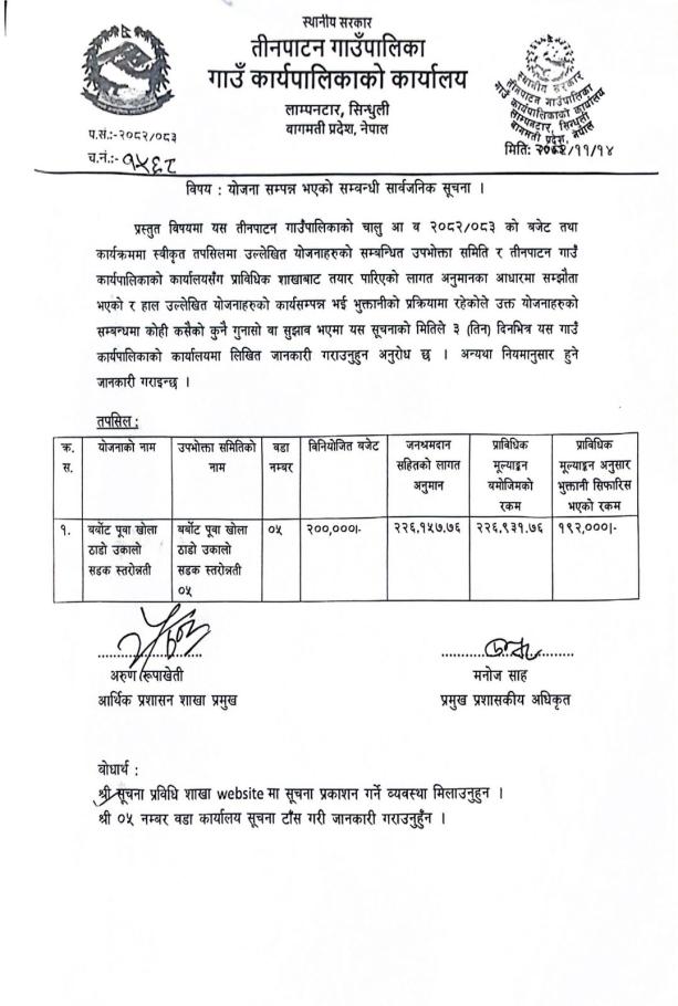 योजना सम्पन्न सम्बन्धी सार्वजनिक सूचना।