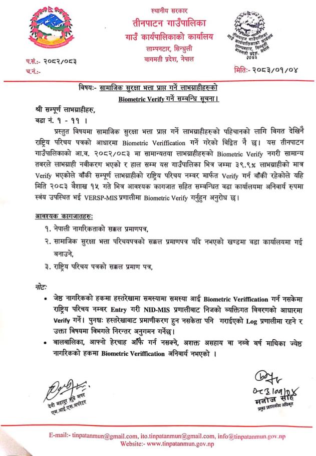 सामाजिक सुरक्षा भत्ता प्राप्त गर्ने लाभग्राहीहरुको Biometric Verify गर्ने सम्बन्धी सूचना।