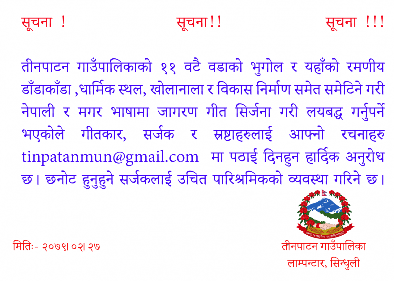 यस गाउँपालिकाको दैनिक प्रशासनिक लगायत विकास निर्माणका कामकाज बारे कुनै गुनासो, राय सल्लाह, सुझाव भए गाउँपालिकाका अध्यक्ष ज्यू, उपाध्यक्ष ज्यू र प्रमुख प्रशासकीय अधिकृतसँग वा हाम्रो फेसबुक पेजमा राख्नु हुन अनुरोध छ ।