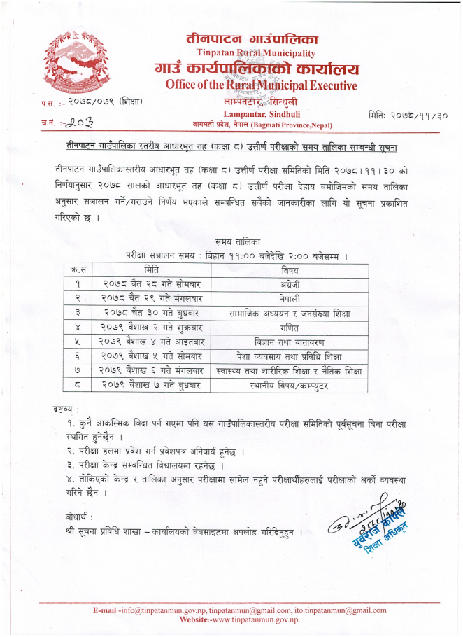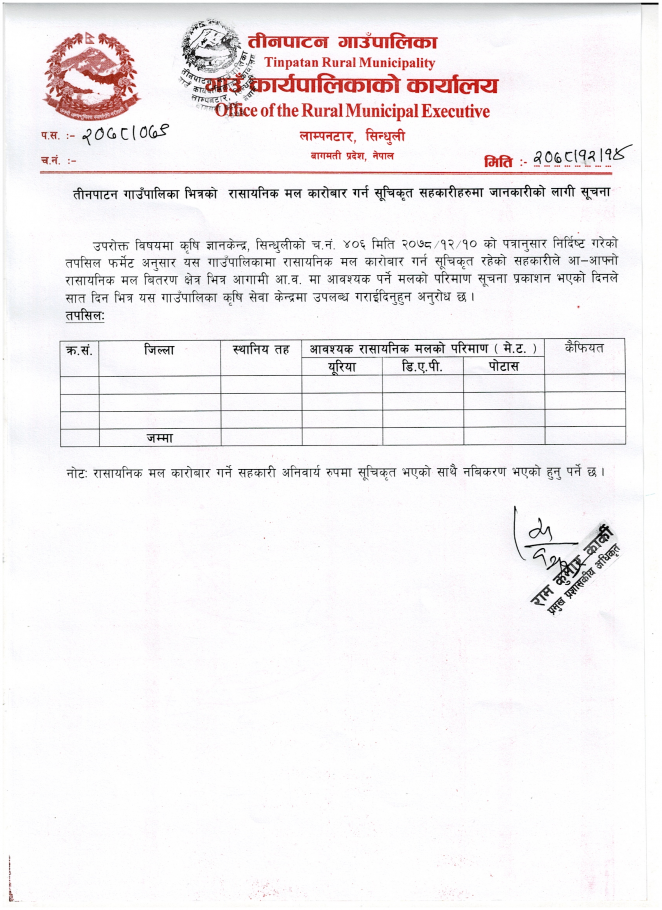 यस गाउँपालिकाको दैनिक प्रशासनिक लगायत विकास निर्माणका कामकाज बारे कुनै गुनासो, राय सल्लाह, सुझाव भए गाउँपालिकाका अध्यक्ष ज्यू, उपाध्यक्ष ज्यू र प्रमुख प्रशासकीय अधिकृतसँग वा हाम्रो फेसबुक पेजमा राख्नु हुन अनुरोध छ ।